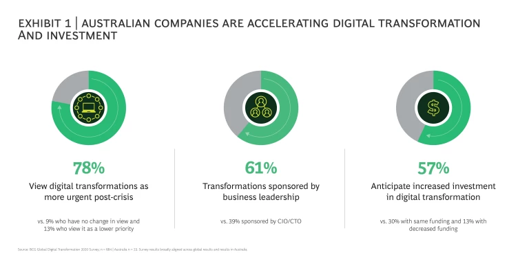 With the disruptions of COVID-19, Australian companies have discovered that what they had planned for in years can now be done in months. This urgency to transform and the opportunities available to the companies brave enough to embrace digital are gaining pace. In a recent BCG survey, over three-quarters of CEOs said they plan to speed up their company’s digital transformation. Digital transformation is also shifting to the heart of a company; getting it right is so critical that 61% of transformations are being led by CEOs and their direct reports (see Exhibit 1).