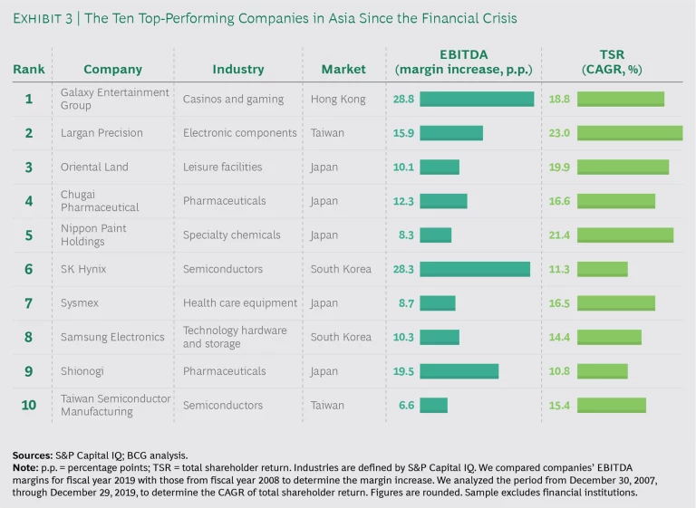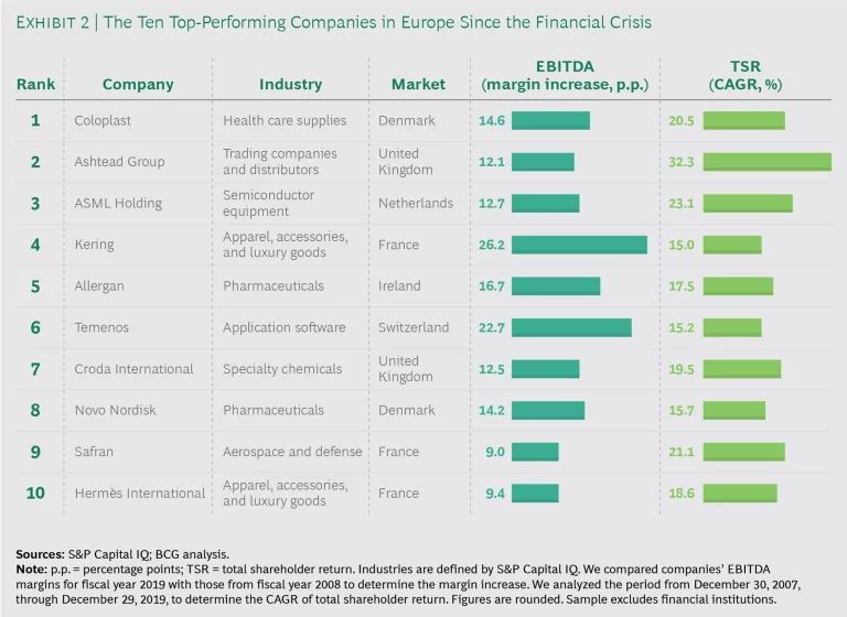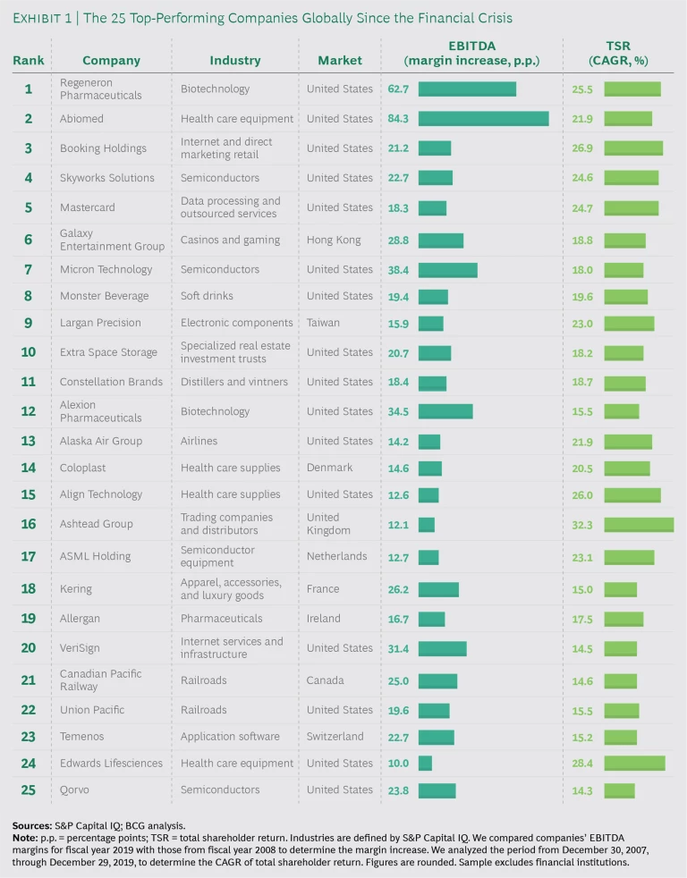 To identify the companies that performed the best worldwide from 2008 through 2019, we evaluated earnings before interest, taxes, depreciation, and amortization (EBITDA) and total shareholder return (TSR) for companies in the S&P Global 1200. (See Exhibit 1.)