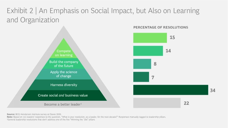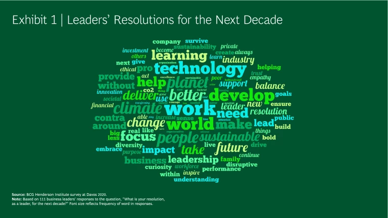 We asked more than 100 business leaders at a BCG dinner what was their most important resolution as a leader for the decade ahead. The biggest emphasis was on societal and planetary issues, mirroring the official program. (See Exhibit 1.)
