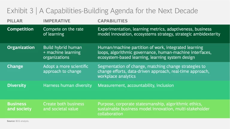 Synthesizing our Winning the ’20s framework and insights gleaned in Davos, we can identify key components of a capability-building agenda for companies in the new decade. (See Exhibit 3.)