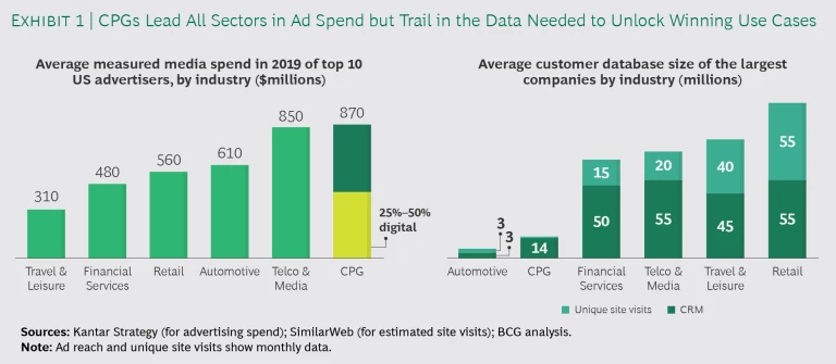 CPGs are prolific advertisers, with the ten largest companies spending an average of more than $800 million each year on marketing—the highest of any industry. At the same time, the largest CPGs have databases of CRM and site data that are, on average, one-tenth the size of the databases of their retail peers. (See Exhibit 1.) This disparity means that for most CPGs, the opportunity to capture and activate consented consumer data remains largely untapped; roughly 90% of the CPG leaders we spoke with cited data collection, activation, and scaling as key obstacles to achieving their marketing goals. Indeed, advanced analytics and AI marketing use cases have the potential for outsized impact for CPGs. In some categories, such as beauty, up to 45% of sales is attributable to marketing, in our experience. Even for other CPG categories, the impact of marketing on sales can be two to three times higher than in other industries. For that reason, the industry is uniquely positioned to capitalize on advanced analytics and AI to make marketing more effective.
