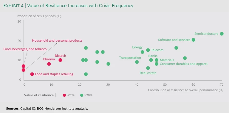 The value of resilience differs by industry. The value of resilience tends to be higher in industries that face deeper or more frequent crises. While the value of resilience is greatest in technology and consumer durables sectors, which have tended to be more volatile, it is lowest in industries with more stable demand, such as food and beverages, household products, and health care. (See Exhibit 4.)