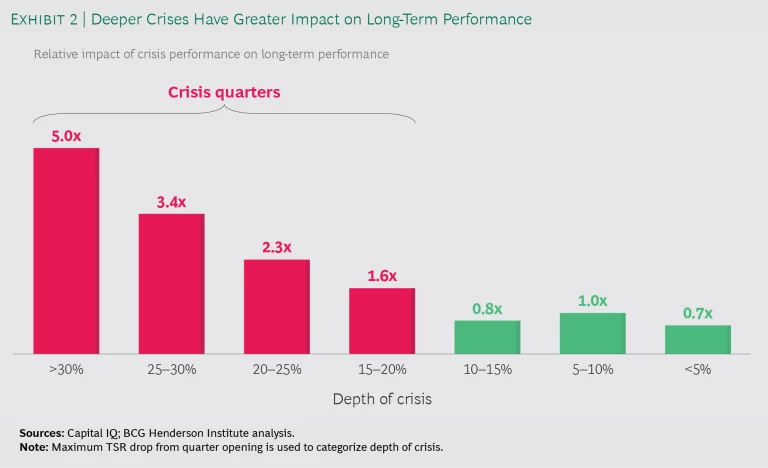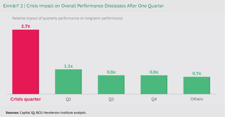 Quarters with a TSR decline of more than 15% have a disproportionately higher impact on overall performance. Moreover, this impact dissipates in the first quarter after the crisis is over. (See Exhibit 3.)