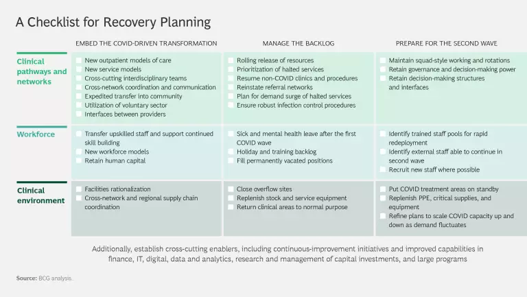 To ensure that the best changes are retained, health systems must take steps to lock in these improvements. Recovery planning should encompass three broad activities: embedding the positive aspects of the COVID-driven transformation, managing the backlog of non-COVID cases, and building organizational resilience for future waves of the pandemic. (See the exhibit for a checklist of specific actions.) All of these will involve clinical pathways and networks, the workforce, and the clinical environment.