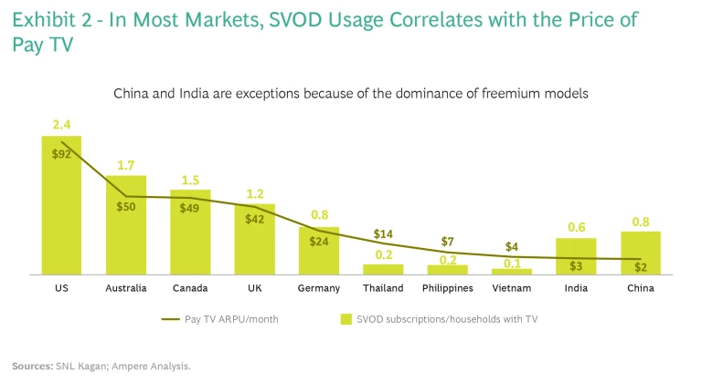 With the exception of China and India, where freemium models are popular, the success of SVOD-only models such as Netflix strongly correlates with the average revenue per user (ARPU) for pay TV in a given market. (See Exhibit 2.) Only a handful of markets, such as the US, Canada, Australia, and the UK, have so far supported substantial ARPUs. In most other markets, video services—both linear TV and streaming video—have remained predominantly advertising supported. The global giants have had to stick with their subscription-only models because of the need to cater to their most lucrative market, the US. But with ample “free” choice available, consumers in other markets are reluctant to pay for video subscriptions. This has caused the big global players to push the SVOD model in markets where it does not work well.