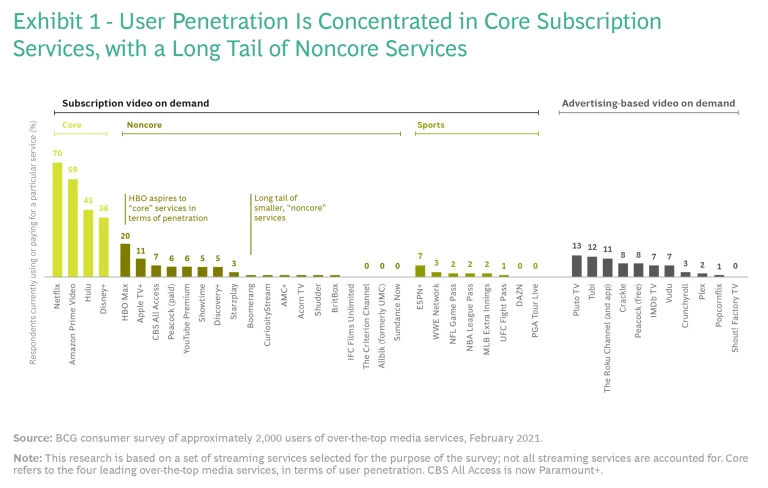 The streaming-video pattern in mature markets is well established. BCG research shows that the average consumer subscribes to two to three streaming services and that the distribution of market share among providers is consistently top-heavy. The top three or four services dominate, with user penetration of 35% to 70%. They are trailed by a long tail of mainly niche services, each with a small, single-digit share. (See Exhibit 1.) A big reason is the staggering amounts that the top players can spend on new content, the key to attracting and retaining subscribers. Combined content spending by Netflix, Amazon, and Disney+ is expected to grow from $23 billion in 2021 to $29 billion in 2025.