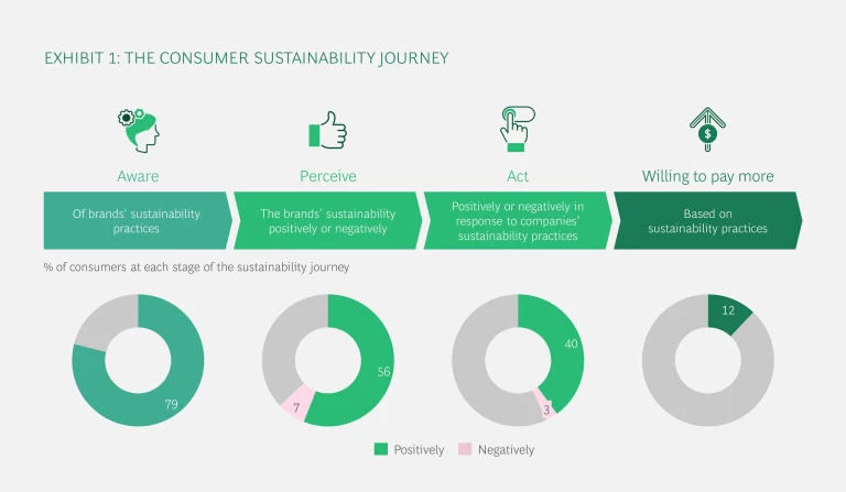 In a typical sustainability journey, a consumer first becomes aware of a company or brand’s sustainability practices, consequently perceives the brand’s sustainability positively or negatively, and finally may take action. The actions that consumers take in response to a company’s sustainability practices can be either positive (such as being willing to pay more for a sustainable product, recommending the brand to a friend), or negative (such avoiding a product or brand, criticising the brand on social media). There is significant drop-off throughout this journey; overall, only 43% of consumers take sustainability-motivated action and only 12% end up willing to pay more. By understanding the sustainability journey, companies can find better ways to retain consumers at each stage and ultimately unlock business value while also driving better social and environmental outcomes.