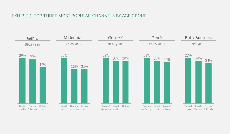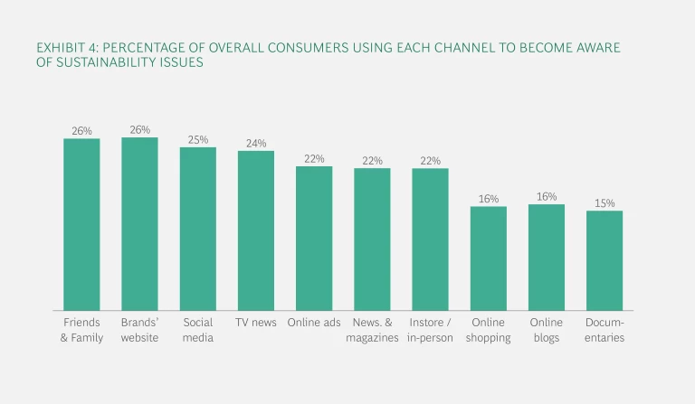 - Tailor communications to align with target demographics’ position along the sustainability journey, as well as their most utilised engagement channels. The top sources of information vary by demographic; younger consumers rely on social media, while older consumers turn to TV and brands’ websites. Choose the channels to raise awareness or interest in sustainability practices carefully, based on your target audience.