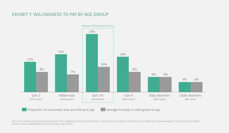 Only a fraction of those interested and acting on sustainability practices change their spending behaviour, with only 12% of overall consumers willing to pay more based on a brand’s sustainability practice. Willingness to pay also varies with age: 23% of 36-45 year olds are willing to pay more, and to pay 10% more on average, compared to 5% of Baby Boomers, who are only willing to pay 5% more.