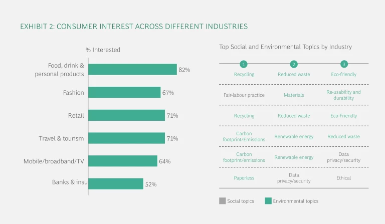 Interest also varies by industry. Consumers are most engaged on sustainability topics for things they buy often, such as food, drinks and personal items. They are least engaged with sustainability in the banking and insurance industry, and the topics they are interested in vary by industry.