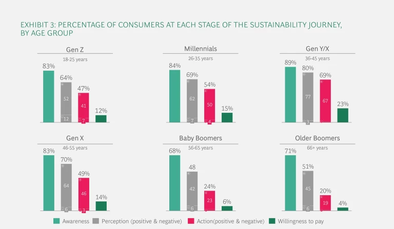 Gen Y/X consumers (36-45 years old) are the most likely to take action once they are aware of a brand’s sustainability practices and develop a positive or negative perception of their sustainability, with less than a 20p.p. decrease between the awareness and action stage of the consumer journey. This age group is the most aware, has the highest level of change in perception based on knowledge of sustainability practices of a brand, and is most likely to take action. This is also the age group most willing to pay more for brands perceived as sustainable.