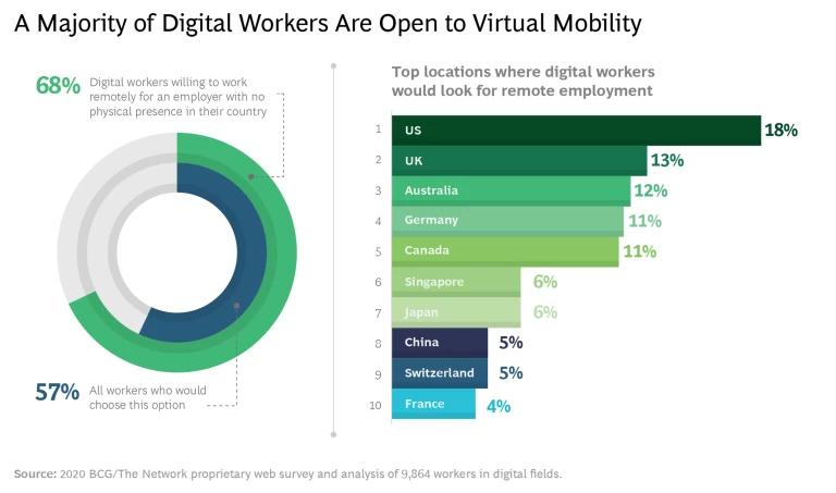 Digital workers’ first preference would be to work virtually for a company based in the US, followed by companies based in the UK and then Australia. Companies in China and Singapore are also attractive as remote employers.