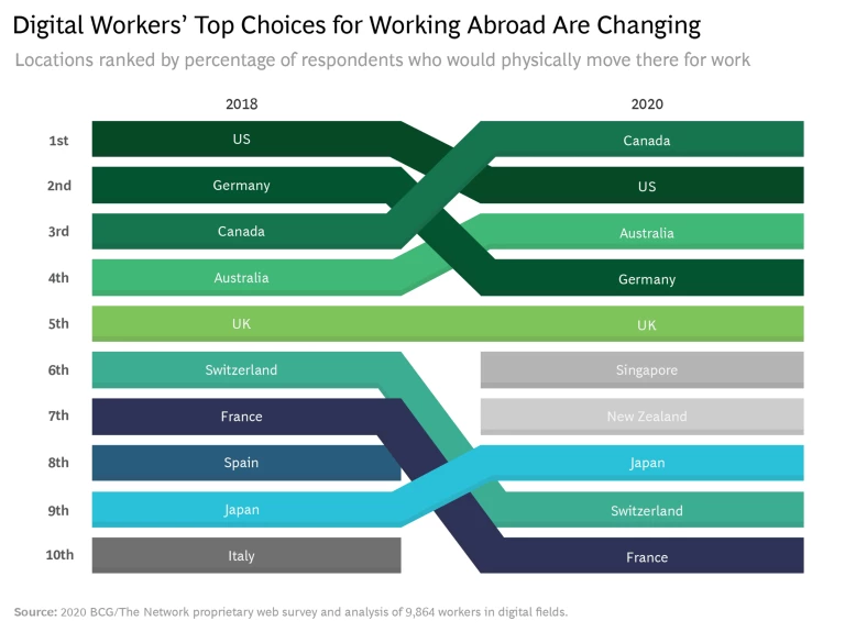 Canada is the new top destination for digital workers who would move abroad for a job, knocking the US into second place. They are followed by Australia, Germany, and the UK. The Asia-Pacific region has emerged as a go-to destination for international assignments, with Australia, Singapore, New Zealand, and Japan increasing in popularity since 2018. London remains the top city that digital workers would consider for a transnational job-related move.