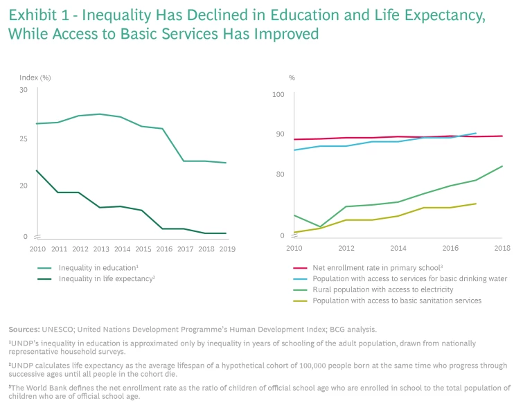At the same time, there are signs that opportunity inequality has also improved. Inequality in education and life expectancy based on income has declined globally; access to drinking water, electricity, and basic sanitation services has improved; and access to education has held roughly steady at a high level. (See Exhibit 1.)
