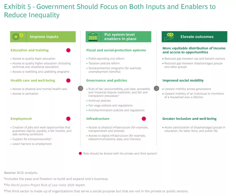 On the basis of our work with governments around the world, we believe governments will need to move in two primary areas to begin tackling inequality. (See Exhibit 5.)