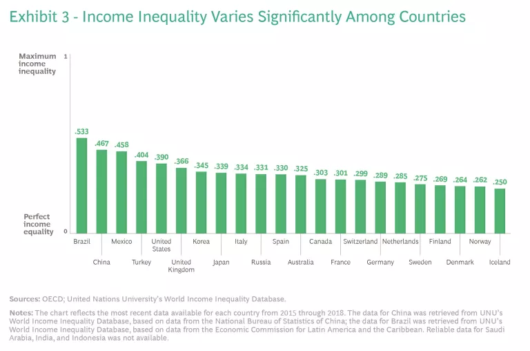 Differences in Magnitude and Drivers. Some countries clearly have a greater inequality challenge than others. Looking specifically at the 17 countries with the largest economies for which recent Gini data is available and the 5 Nordic countries (often lauded for progress on equality), a wide variation in income inequality is evident. (See Exhibit 3.) For example, while the US, Australia, and many countries in Europe are developed nations with similar levels of wealth and natural resources, the US has a much higher level of income inequality. That disparity indicates that government policy plays a major role in determining income inequality levels.