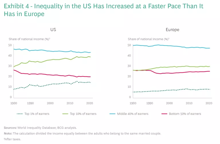 The Complex Dynamics in the US and Europe. The complexities outlined here shape the inequality challenge for each country and region—and, therefore, the required policy response from individual governments. A close look at the dynamics in the US and Europe highlights the differences.