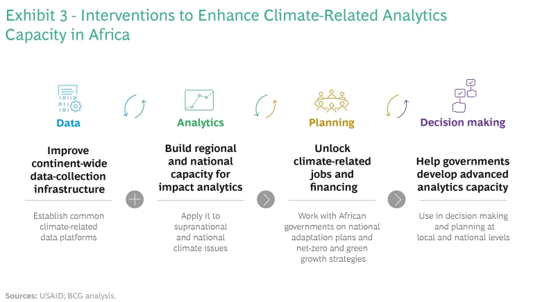 Exhibit 3 shows four interrelated areas with great promise for enhancing climate-related analytics capacity, and thereby improving decision making and planning. The first is to invest in data collection infrastructure, gathering detailed information on weather and climate patterns, emissions, and vulnerability.