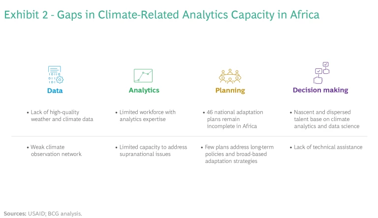 Decision makers have long articulated a need for support to understand the risks, financing needs, and trade-offs related to climate change, especially for the most-vulnerable populations. Today, data-informed planning is constrained by the insufficient quality and granularity of climate data for the African continent. Analytic capabilities—which are needed to apply the data and insights to real-world decision making and action—are also limited. (See Exhibit 2.) Investment in these competences is critically important for the continent. It will enable evidence-based decision making by building up the necessary infrastructure and skills.