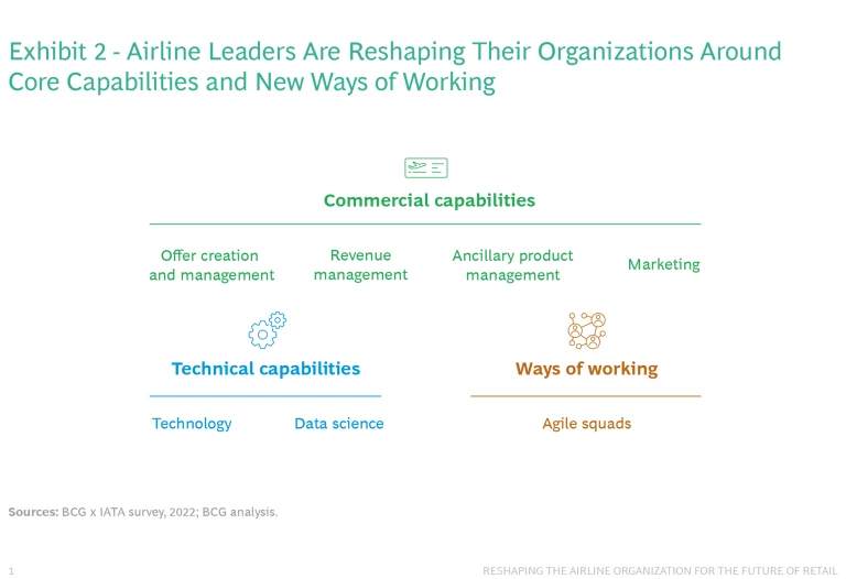 The carriers that have already made progress have shared that they are determining where teams should sit on the basis of their company’s context, and it’s clear that no one-size-fits-all approach exists for codifying these capabilities in the organization chart. But these leaders generally agree on which capabilities are needed for the future of retail. In addition, they are beginning to organize their teams around commercial and technical capabilities, and they are adopting new ways of working. (See Exhibit 2.) The following isn’t an exhaustive list; rather, it includes some of the key competencies that airline executives are focused on today.