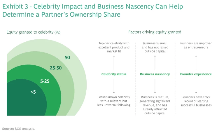 From the celebrity’s perspective, the lure of equity is probably most attractive if the company is at an early stage, when the celebrity’s stake could potentially grow dramatically. The more mature a brand, the less direct influence the celebrity can have on its success. And being further down the risk-reward spectrum may be less compelling for a celebrity seeking to diversify sources of personal wealth creation. The question for brands, of course, is how much of a stake they should be willing to give away. This depends on several factors, but the basic equation comes down to balancing growth needs with a celebrity partner’s potential impact. (See Exhibit 3.)