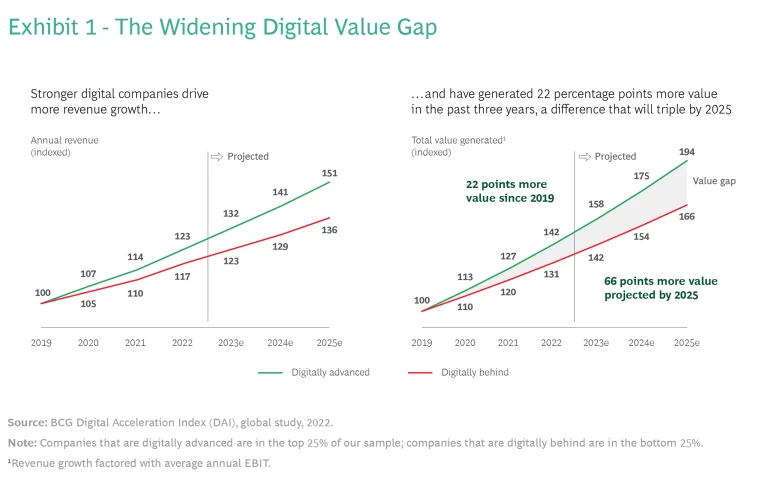 If current trends continue, the cumulative value gap will triple to a 66-point margin for digitally advanced companies by 2025.