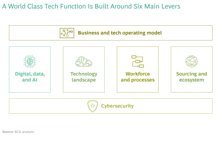 All too often we have seen companies embark on just one or two dimensions of a technology transformation, effectively dooming the effort. For instance, the company might double down on digital, data, and AI but neglect to transform its workforce, revamp its sourcing strategy, or simplify and enhance its tech landscape. Or the company might make a big insourcing play, only to learn belatedly that its new talent is frustrated by lingering legacy systems. In other words, a piecemeal approach to technology transformation is a no-go. Companies must move in parallel across six critical dimensions to establish a world-class technology function. (See the exhibit.)