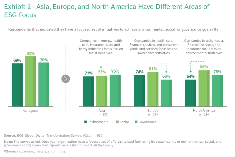Regionally, social initiatives are the most-pursued priority in North America and Europe, where diversity, equity, and inclusion concerns run high, while governance initiatives rank first in Asia. Companies in Europe (74%) and Asia (71%), where most countries are net energy consumers, are more likely to prioritize environmental initiatives than companies in North America (64%), a major center of fossil fuel production as well as use. (See Exhibit 2.)