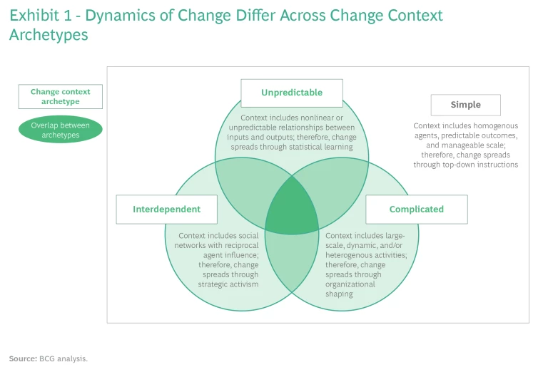 This article focuses on four key context archetypes. Simple change contexts are those in which agents are homogenous, predictable, and manageable. Unpredictable change contexts are those in which the relationships between inputs and outputs are unclear, so the effects of specific interventions are hard to predict. Interdependent contexts are those characterized by networks of reciprocal interactions in which social influence from peers has a stronger effect on agents’ behaviors than top-down influence. Finally, complicated contexts are those that are dynamic, large in scale, and/or composed of heterogenous agents. These archetypes do not exhaust the variety of possible change contexts. However, they highlight some ways in which change efforts need to depart from traditional change management techniques to be effective in specific contexts.