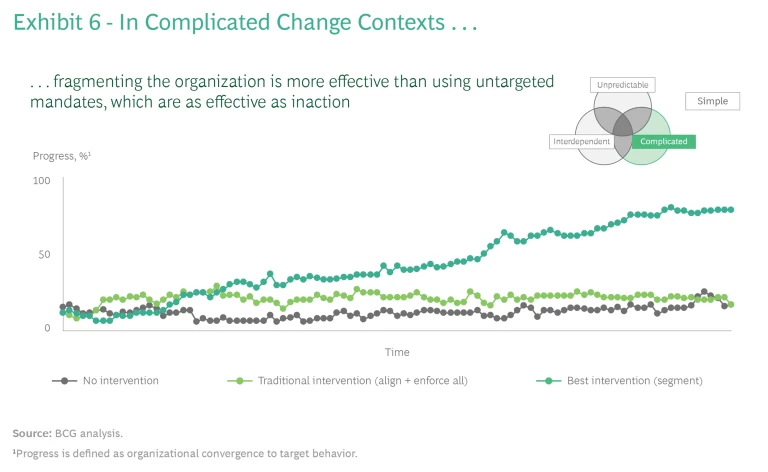 Complicatedness. Finally, we simulated complicated change contexts. These contexts are modeled as organizations in which each agent has a different target behavior, meaning that leaders cannot simply use a one-size-fits-all approach. Instead, leaders should segment the organization into smaller units that can then be given a set of standardized behaviors. To do this, leaders need to target smaller groups of agents—or even individuals—to enforce the correct behavior. (See Exhibit 6.)