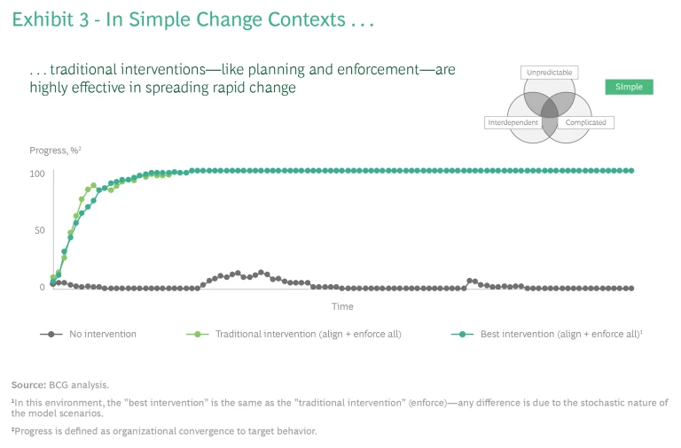 We used this combination of interventions (align and enforce) across the remaining change context simulations as a proxy for traditional change management methods in order to illustrate how alternative interventions can be more effective in unpredictable, interdependent, and complicated contexts.