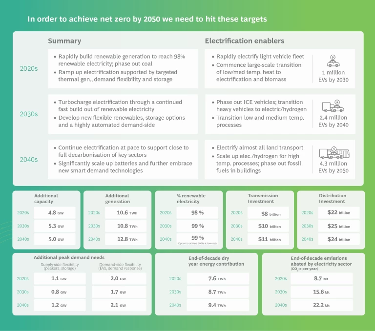 The following infographic conveys what needs to be delivered each decade, along with six recommendations to achieve net zero.