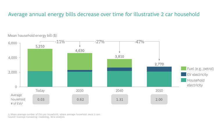 Greater electrification, supported by a higher penetration of renewable electricity generation and energy efficiency improvements, can lead to reduced household electricity bills (excluding home electric vehicle charging)—around 11% lower in 2030 and 47% lower in 2050—as consumers benefit from significant overall fuel savings due to the electrification of transport.