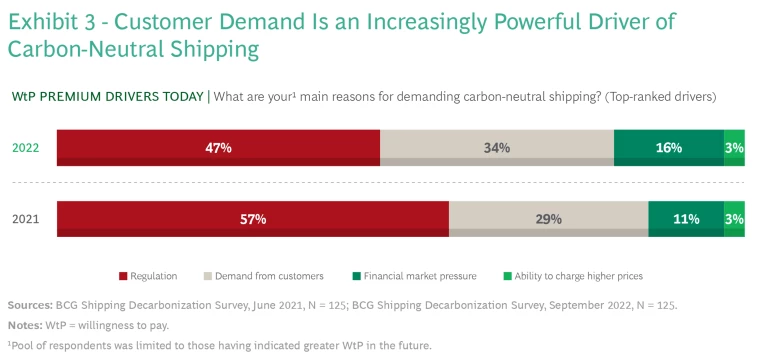 While regulation remains the most common driver of WtP premiums, demand in the shipping customers’ value chain—thus including demand from consumers—is playing an increasing role, rising from 29% in 2021 to 34% in 2022. (See Exhibit 3.) Such growth included an increase of more than 9 percentage points in the high WtP segment and more than 5 percentage points in the low WtP segment. This dynamic mirrors a general consumer trend, as 57% of consumers are willing to change their purchasing habits to help reduce negative environmental impact and 33% are already choosing brands that have publicly embraced environmental or social causes, according to a report by the Maersk Mc-Kinney Moller Center for Zero Carbon