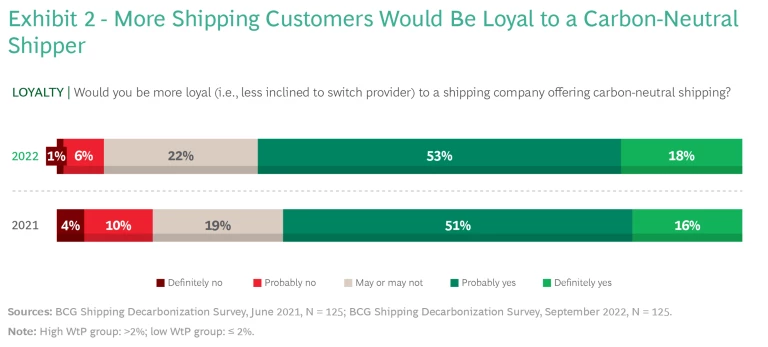 In addition to increased WtP year on year, more shipping customers are responding that they would be more loyal to a zero-carbon shipper. (See Exhibit 2). Overall loyalty is higher (71% in 2022 versus 67% in 2021), with a significant shift in the low WtP segment—where only 11% of respondents were not inclined to be more loyal in 2022, compared with 20% in 2021. This higher level of commitment poses a clear opportunity for shipping companies and their customers to forge closer partnerships to share both the costs and benefits of a decarbonized value chain.