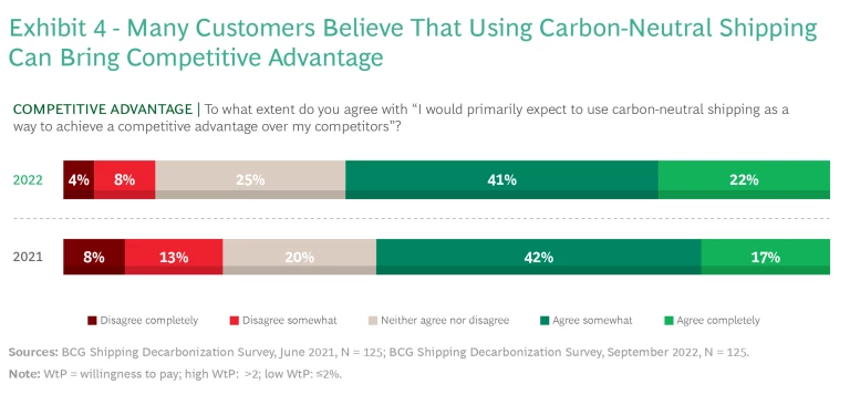 A further driver of WtP is the notion that shipping customers stand to gain competitive advantage by using carbon-neutral shipping. In our 2022 survey, 63% of respondents believed in this principle, compared with 59% in 2021. (See Exhibit 4). In parallel, the idea that zero-carbon shipping cannot deliver a competitive advantage was believed by 21% of respondents in 2021, but only 12% in 2022. Further, a growing proportion of survey participants believe that competitive advantage driven by carbon neutrality can deliver financial benefits. Such responses indicate that decarbonization is being increasingly seen as a competitive asset, not just a compliance obligation. They also suggest that many shipping customers expect to be commercially hurt if they don’t act.