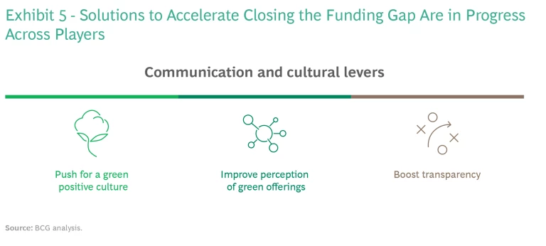Within communication and cultural initiatives, we see three overall levers for achieving carbon neutrality. These include pushing for a green-positive culture, improving the perception of green offerings, and boosting overall transparency. (See Exhibit 5).