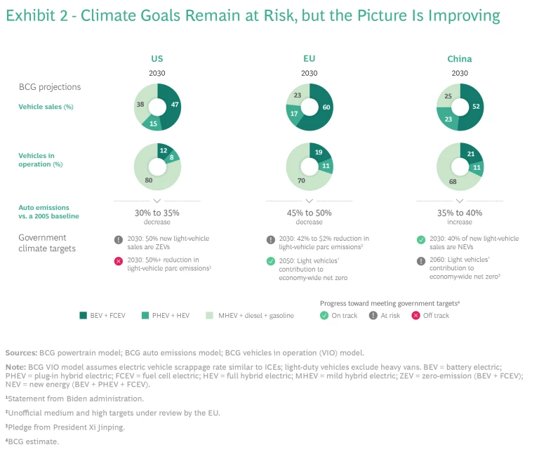 Our revised modeling holds out greater hope for the health of the planet as well. The European Union’s announcement banning sales of new ICE vehicles from 2035 is a game changer for the global automotive industry. It puts the bloc on course to hit its 2050 emission reduction targets for transportation. The US, while it still has work to do to achieve its climate goals, is also in a better position than when we last reviewed the sector in early 2021.