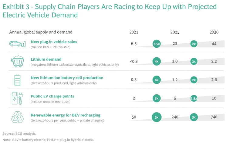 Although the transition to electrified mobility is quickly gathering momentum, we have identified two short-term supply risks that could limit the rate of industry change—or spur greater innovation as players seek to overcome these obstacles. First, a supply shortage has emerged during the past half year in the metals needed to make EV batteries, including lithium and nickel. Second, insufficient charging infrastructure over the next few years could cause EV adoption to stall in leading markets such as the US, especially in cities like Boston, where it can take time to bring additional power distribution capacity online because of logistical challenges and the limitations of existing power distribution infrastructure. According to our market outlook for global BEV and PHEV sales, supply chain players will need to accelerate their efforts in these areas to keep pace with future demand. (See Exhibit 3.)