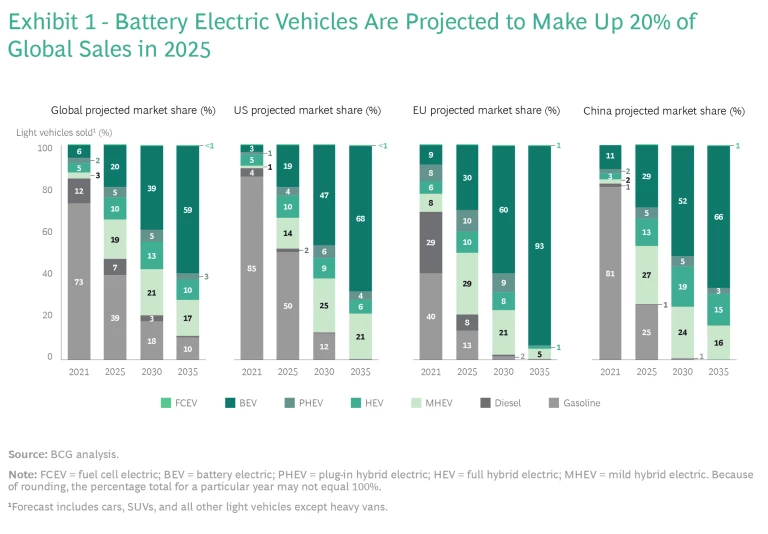 The future of the automotive industry is electric. The factors highlighted earlier will significantly accelerate the market dominance of BEVs—it will happen faster even than we anticipated in our previous forecast. We now expect BEVs to account for 20% of global light-vehicle sales in 2025 and 59% in 2035. (See Exhibit 1.) By comparison, in last year’s report, we projected a BEV market share of 11% in 2025 and 45% in 2035. In our latest outlook, the share of full hybrid electric vehicles (HEVs) and PHEVs remains largely unchanged compared with our prior forecast. The main differences are a shift away from full gasoline vehicles and a lower uptake of mild hybrid electric vehicles (MHEVs) across all regions, benefiting BEVs.