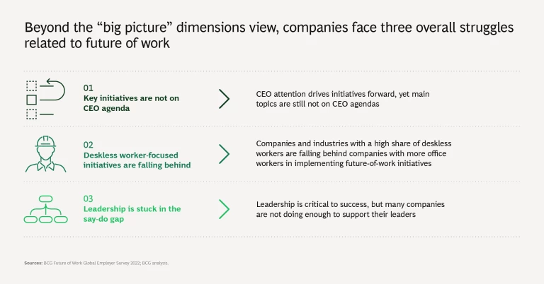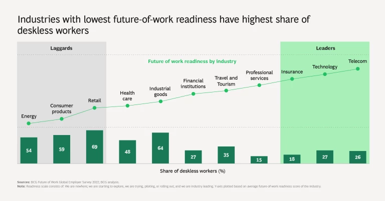 The survey also shows that companies are focusing more on office-based workers, who can work remotely, and are less focused on the “deskless workers” who make up more than three quarters of the global workforce. These deskless workers—in factories, shops, hotels, restaurants, and hospitals—cannot work from home. Only 8% of executives say that amplifying support for the deskless worker is a CEO priority. The telecom, technology, and insurance industries are top-ranked in their future-of-work readiness, and only about one quarter of their workers or fewer are in deskless jobs. Energy, consumer products, and retail—the three lowest-ranked industries on future-of-work readiness—employ deskless workers for more than half their jobs. The survey results are a stark reminder that deskless employees who continued to work on site during the pandemic risk losing out on the benefits of future-of-work innovations.