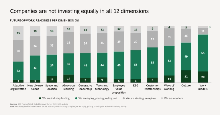 Even where they are making relatively more progress, specifically on purpose-driven culture and work models, organizations still have more work to do. Most companies, for example, are still trying, piloting, or rolling out new work models. For each dimension, only 20% or less consider themselves to be industry leading.