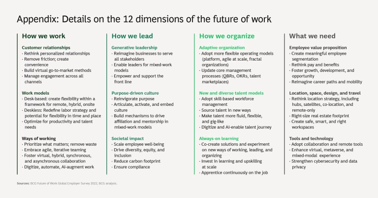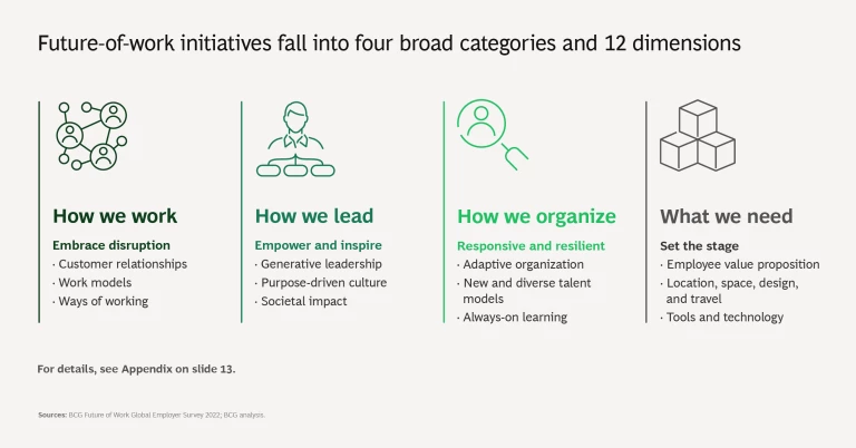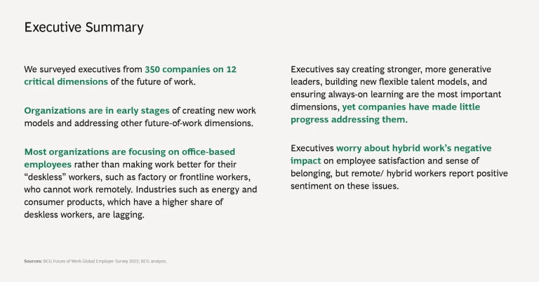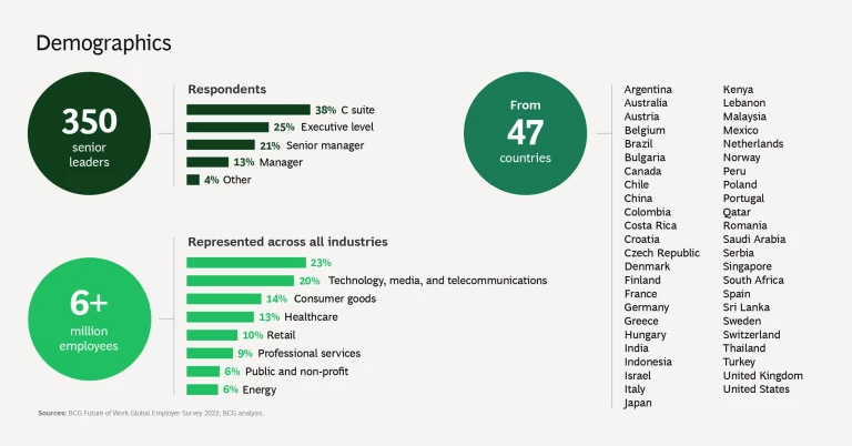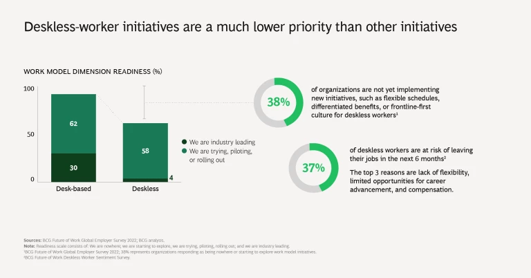 The accompanying slide show illustrates these findings in more detail. The analysis also relies on findings from the BCG Future of Work Deskless Worker Survey, conducted in March and April 2022, which surveyed 7,104 deskless workers in Australia, France, Germany, India, Japan, the UK, and the US.