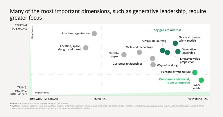 The survey asked leaders their perspectives on the importance of 12 future-of-work dimensions—and their company’s progress on this front. We found that companies are still early in their pursuit of a better future of work in many critical dimensions. Executives said their organizations lagged on key people-oriented dimensions, such as generative leadership, always-on learning, and new and diverse talent models—despite ranking them as being very important.