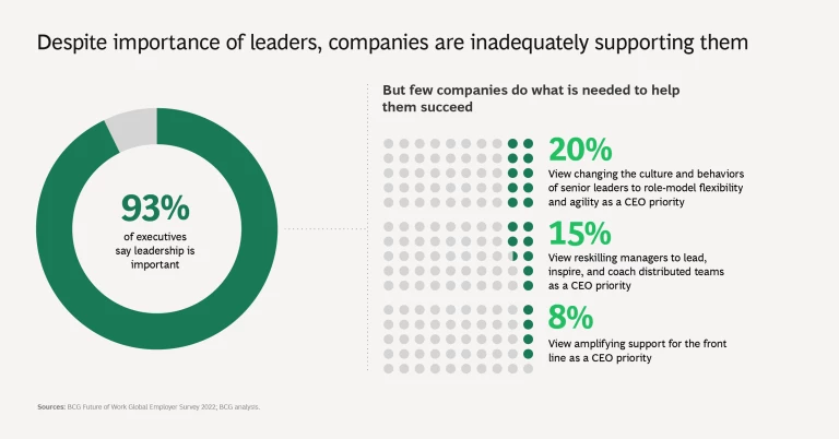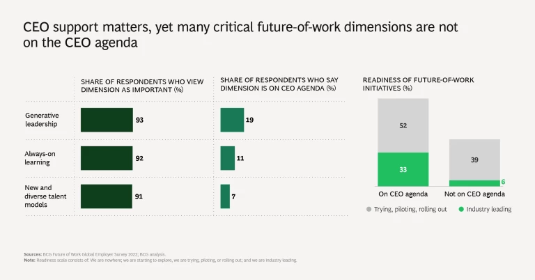 The surveyed executives recognize the need for strong, generative leaders to realize a better future of work, but they also say their companies are not doing enough to help leaders develop the necessary capabilities. Only 15% of respondents said that reskilling managers to lead, inspire, and coach distributed teams was a CEO priority, and only 20% see changing the culture and behaviors of senior leaders to role-model flexibility and agility as being a CEO priority. But, when a future-of-work initiative is on the CEO agenda, executives are nearly twice as likely to report progress on it. For the future of work to work, CEOs need to be leading from the front.