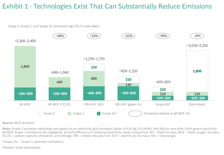 Direct-Reduced Iron with Electric Arc Furnaces. Replacing the blast furnaces and basic oxygen furnaces (BF-BOFs) of a traditional integrated steel producer with production based on direct-reduced iron and electric arc furnaces (DRI–EAFs) is one mature technology option. DRI production facilities consume high-grade iron ore pellets and run on natural gas (NG). Eventually, however, they are likely to use green hydrogen (H2). This technological improvement could reduce emissions by 33% to 55% compared with the BF-BOF production route, taking into account Scope 1, Scope 2, and upstream Scope 3 emissions. Over 100 million tons of NG-based DRI-EAF production capacity is already in place worldwide.
