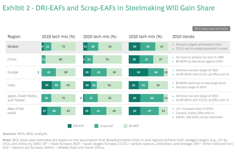 Steel Scrap. Using EAFs to process scrap steel is a proven pathway to decarbonize the production of commodity-grade steel. To produce higher grades of steel, companies must use DRI-EAFs. Europe already heavily recycles steel, but other regions, such as China, have significant untapped potential to use recycled scrap. Even so, at a global level, scrap will likely be in short supply and so cannot fully replace ironmaking.
