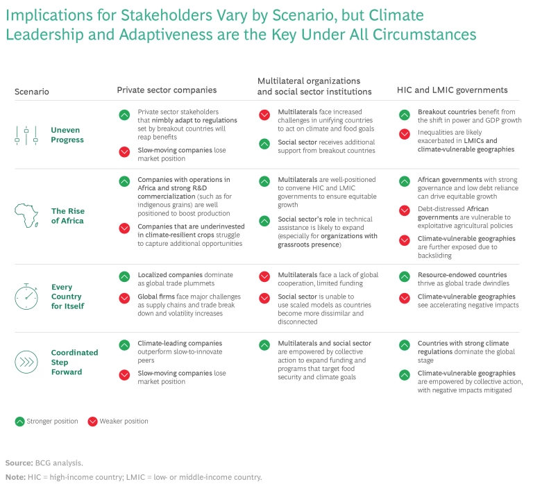 Although future events will not match any of the scenarios exactly, each scenario entails strategic repercussions for the three stakeholder groups—governments, multilateral and social sector organizations, and private sector companies—that have major stakes in the food systems of the future, and each suggests no-regrets moves that each stakeholder group should consider taking after weighing the strategic implications. (See the exhibit.)