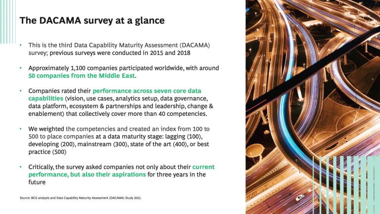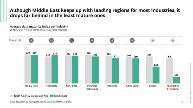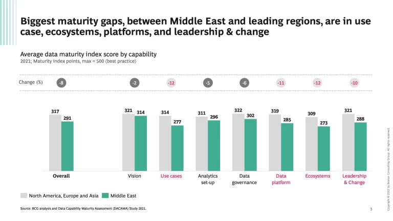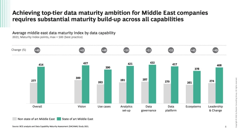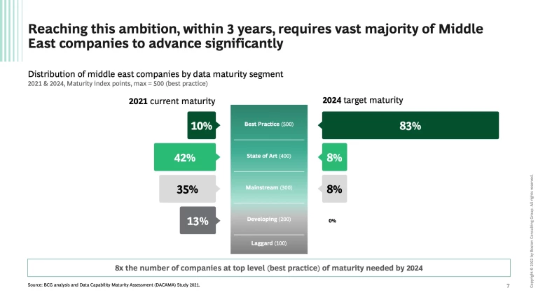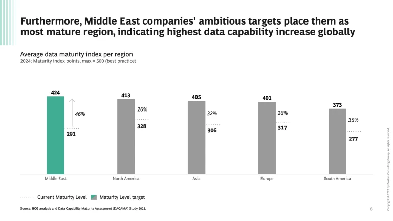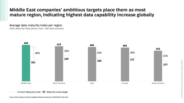 Data maturity is the next top-priority strategic agenda item as companies worldwide continue the pursue higher data maturity scores in order to grow and meet their business models and commercial ambitions. As indicated by our recent survey, nowhere is data maturity more important than in the Middle East as companies tend to be data competitive in some areas but data lacking in others, and there is a material gap compared to global best-practices. Success in the region will require a comprehensive, bold but balanced approach, to indeed become data maturity trailblazers.