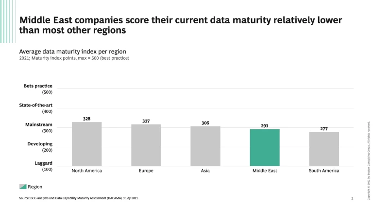 The focus on data maturity is apparent from participants in our third survey, which acknowledged data maturity levels that are lower in the Middle East than in most other regions. For example, on a scale from 100 (laggard) to 500 (best practice), the Middle East scored a 291. A ranking that is a little behind North America, Europe, and Asia and slightly ahead of South America.